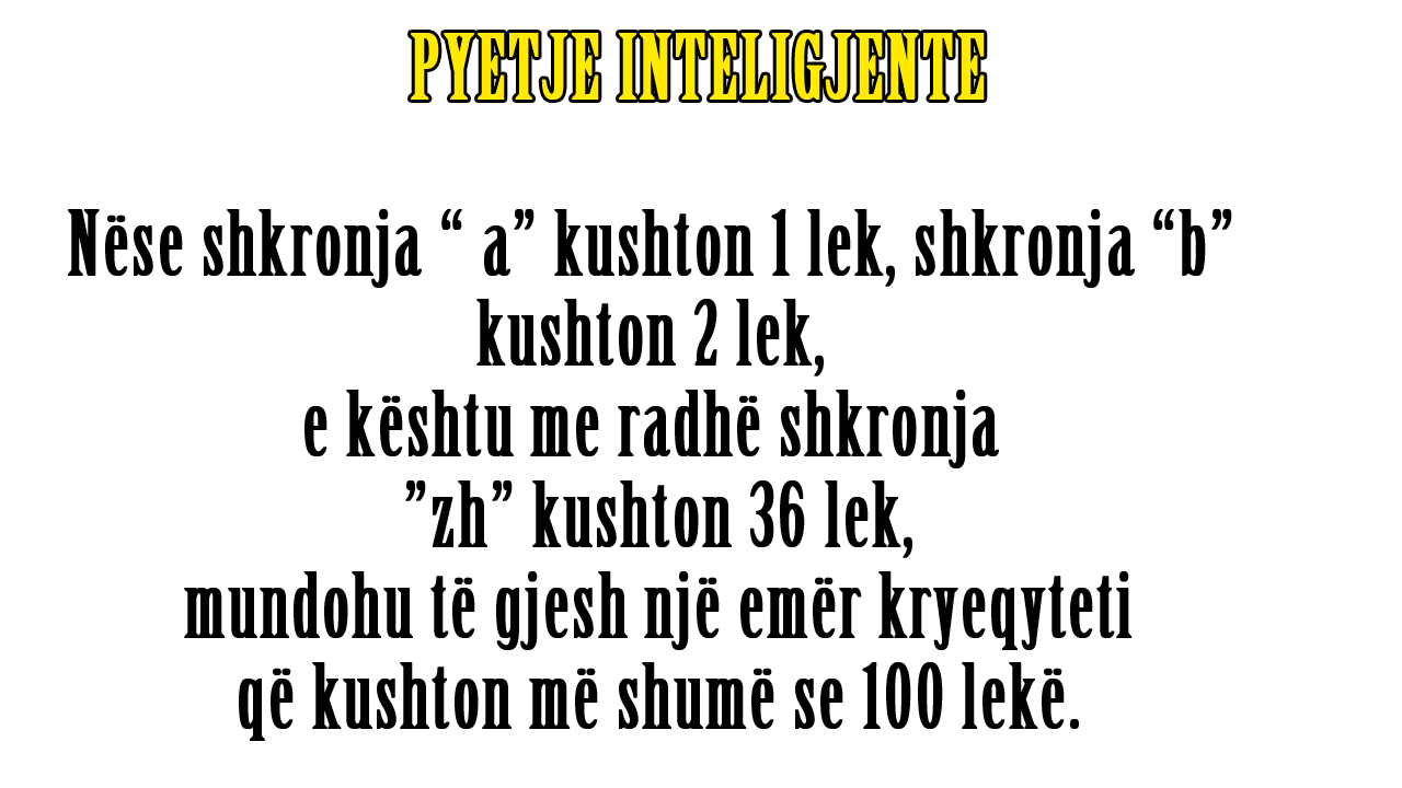 Nëse shkronja “ a” kushton 1 lek, shkronja “b” kushton 2 lek, e kështu me radhë shkronja ”zh” kushton 36 lek, mundohu të gjesh një emër kryeqyteti që kushton më shumë se 100 lekë.